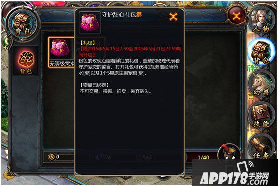 活动期间,等级达到30级的冒险者每天都可在守护天使爱丽娜处领取1个守护甜心礼包。守护甜心,守护爱恋,温馨的礼包伴你度过甜蜜520——打开即可获得520网络情人节礼物。