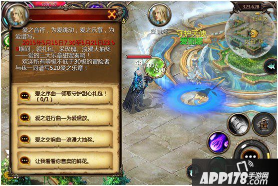 1、2015年5月15日7:30至5月21日23:59期间,在卡诺萨城使用爱的指南针可导航至守护天使·爱丽娜(325,624)处,向她了“520爱之乐章”活动的相关情况。