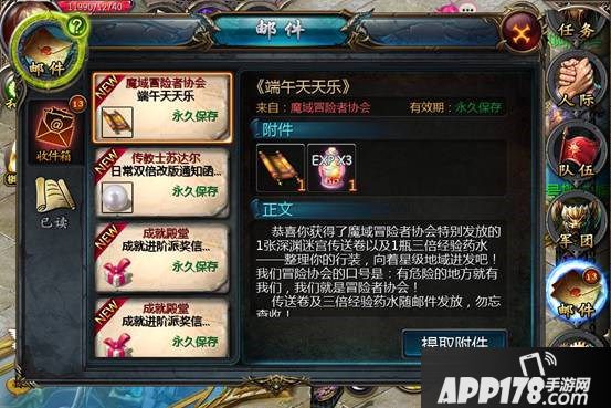 2、【活动1】端午天天乐:活动期间,冒险者们每天登录魔域世界都会收到1封邮件——内含1张与你等级相对应的星级传送卷[绑]以及1瓶三倍经验药水[绑]。