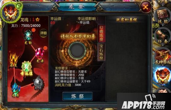 培养方式:①幻兽炼祭:将符合条件的幻兽放入中心圆框即可进行炼祭;②宝石炼祭:龙魂幸运值达到70以上即可使用幻魔晶石或幸运药水进行炼祭。(注:以上两种炼祭方式均需消耗龙力值)