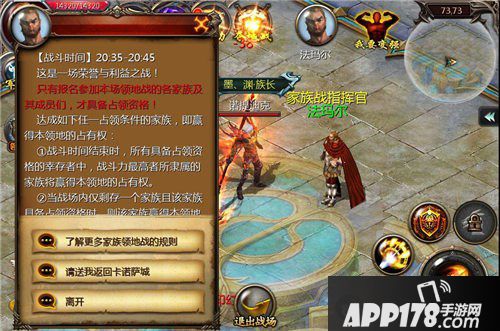 想要了解作战规则或是中途想要离场的话,可找家族战指挥官·法玛尔。