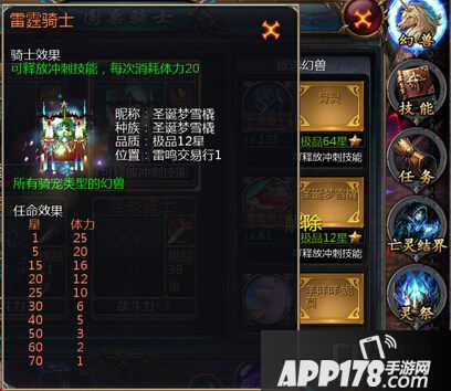 “雷霆骑士”使用秘籍:任命“雷霆骑士”后,能马上获得1点战斗力提升;同时根据幻兽星级可获得相应的跳跃次数,还可以在跑商和特殊区域进行跳跃。所有骑宠都可以任命为雷霆骑士,根据星级进行跳跃时候所消耗的体力值也有所不同,因此跳跃次数也会有所差别(一般状态下正常体力值为100,有神之祝福时为150)。