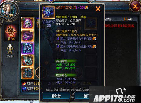 点选【菜单】-【人物】后可进入着装界面,任意点选所穿戴的武器或装备即可查看其详细信息,其中的“装备评分”可直观体现出其价值。“装备评分”由如下各项战斗力累加得出。