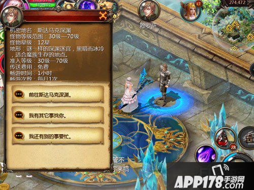 首先我们要找到去往深渊的NPC:驱魔远征军•穆罗萨(卡萨诺城 273.473),就在领双处右边,可以先去领个双倍再去深渊。更让人惊喜的是,去往深渊对于新人来说也特别友好,与火山、迷宫不同,斯达马克深渊是完全免费(每日1次,每次1小时)。