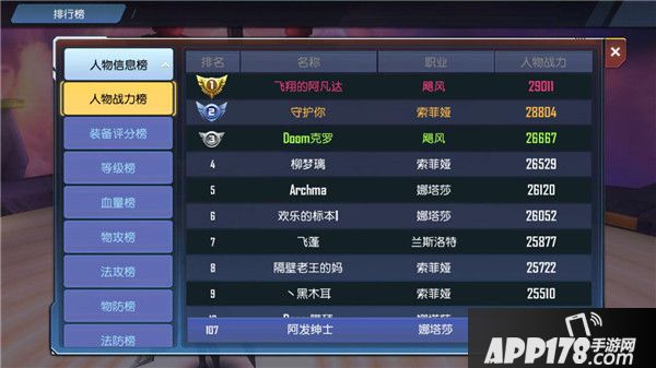 统计玩家各方面数据并进行展示的地方,包含以下榜单:战力榜、装备榜、血量榜、物攻榜、法攻榜、物防榜、法防榜、等级榜、职业排名榜。