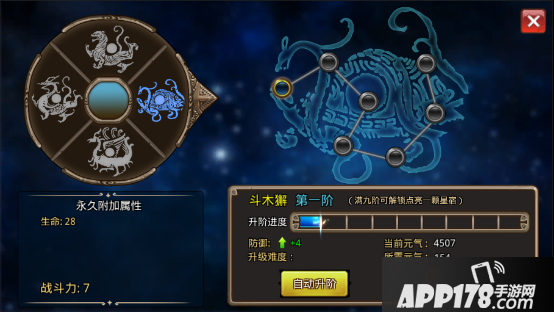 在游戏中,玩家也可以通过观星系统来提升自身属性,当完成“保全霸星”任务后,便可以开启观星系统。在游戏中共设置了【角木蛟】、【亢金龙】、【氐土貉】等二十八个星宿,分别对应了28个阶段,每个阶段分又为9阶,玩家需要通过消耗元气来提升星阶,获得永久加成的属性。提升星阶的元气可以通过打怪、使用元气丹道具和任务获得。
