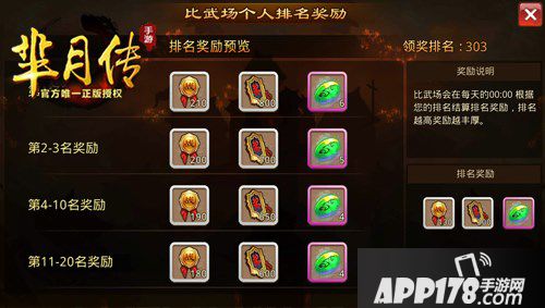 排行榜不仅代表实力,同时也有丰富的奖励来鼓励各位强者。首先,玩家在比武场中的每次挑战都能收获经验,战功和荣誉。战功可以提升角色爵位,荣誉可以在比武商店购买各种稀有道具!其次,榜上按名次分为11个档次,玩家达到每档名次后,每天的00:00根据您的排名结算排名奖励,排名越高奖励越丰厚。