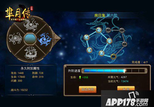在游戏中,“观星之术”作为游戏系统呈现在玩家面前,玩家可以通过观星系统来提升自身属性,当完成7级“保全霸星”任务后,便可以开启观星系统。在游戏中共设置了【角木蛟】、【亢金龙】、【氐土貉】等二十八个星宿,分别对应了28个阶段,每个阶段又分为9阶,玩家需要通过消耗元气来提升星阶,获得永久附加属性。提升星阶的元气可以通过打怪、使用元气丹道具和任务获得。