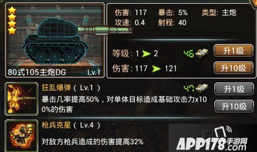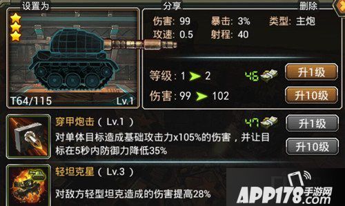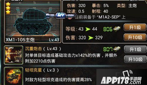 每辆坦克均带有相应的技能,推荐有沉重炮击技能的武器,颜色差一级都没关系。高级时一发不暴击3、4K,打通缉和军演都非常好用,小兵一炮一个,坦克皮薄的也一样,厚点的2炮也解决了,扫荡战场的不二法宝啊...