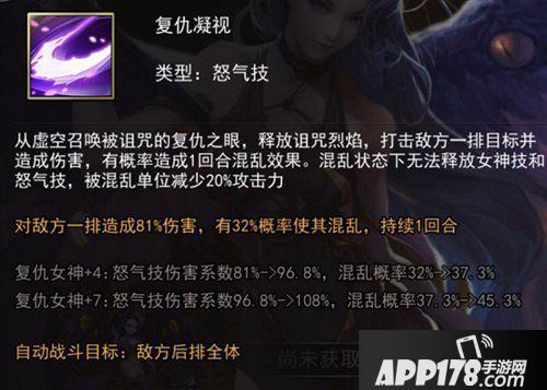 以上就是女神联盟2手游全部英雄介绍,复仇女神用于竞技是个不错的选择,眩晕技能比较强势,能够废掉对方技能,是个值得培养的英雄,所以拥有了就不要错过!更多女神联盟2手游资讯欢迎关注APP178手游网。