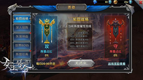 9377《女王号令》轮回战场,会在每日的20:00开放,光明以及愤怒两大阵营的勇士强者可以自由前往参战。轮回战场之中分为愤怒保卫战、光明保卫战以及无尽争夺战这三大战场,无论是作为进攻的一方,还是防守的一方,都无关紧要,重要的是保证己方阵营的胜利!