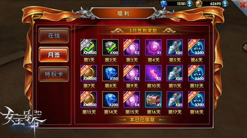 而除了删档测试的专属福利之外,9377《女王号令》还拥有“每日签到”以及“在线福利”等日常福利玩法,其中“每日登陆”福利包括星灵点、宝石箱子、金币以及钻石等等,而“累计在线福利”则包括魔晶、银镐、藏宝图以及召唤石等奖励,同样丰厚无比!
