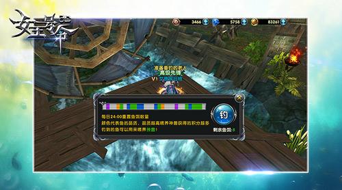 《女 王号令》里的钓鱼是运气和手速的结合体,在鱼漂划过横条上的色块时眼疾手快地按下“钓”,就能钓到该色块对应的鱼了。河里有小黄鱼、红剑鱼、黑玛丽、蓝曼 龙以及珍珠马三甲这五种,品质由低至高分别对应着白、绿、蓝、紫、橙,当然品质越高的鱼就能得到越多的奖励,当你带着鱼喂给公会的巨型吃货——公会神兽 时,它还会挑品质给你对应的公会币哦!
