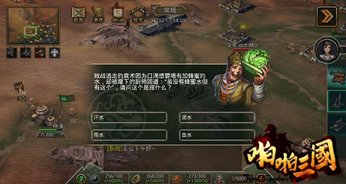 玩家的部队出征到达敌方的城市时,必定会触发随机事件,分为对话事件、选择事件、战斗事件、答题事件四大类。对话事件通过点击即可结束;选择事件将给玩家不同的选项,点击选项,选择不同的后续事件;战斗事件触发后,系统将在玩家所扰袭的势力中,选择之战力相近的玩家进行对战,战斗成败也将决定后续事件的走向;答题事件最考验玩家是否文武双全,唯一的正确答案,你能选中吗?
