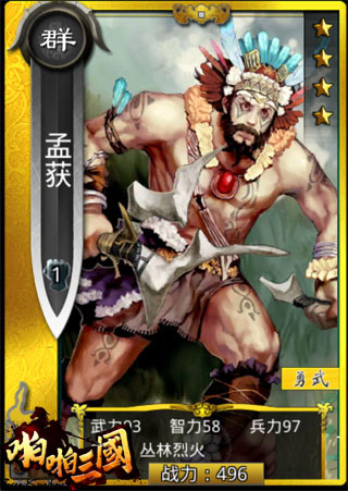 中丞孟获,群雄 骑兵 强袭勇将。专属战器:刀。被动:雄狮、持盾、会心。专属战器:百兽猎刃,强化被动:反弓。连协:诸葛亮、刘禅、祝融夫人。技能:天南蛮入侵,消耗士气4 自身周围部队武力值提高30%,持续12+12秒。并对敌方武力值最高部队造成34083的基础伤害,实际伤害受双方武力差距影响。同时自身召唤冲车作战,最多存活15秒,冲车不会回血。