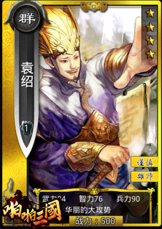 颜良、文丑都五星化了,其主公袁绍,怎么能还是四星?所以不少玩家开始YY袁绍的五星版本,作为群雄势力一名主公的袁绍实力绝对不同凡响。乱击袁绍,万箭齐发耗士气4。对场上敌方所有造成特殊伤害(贯射,枪击,突击)。造成一定基础伤害,由己方总部队武力总和地方部队武力总和的差距影响附加伤害。