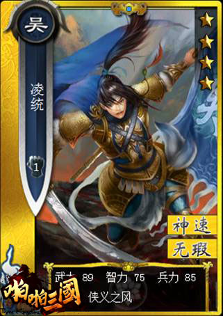 凌统是在三国里少有的子承父业的青年武将,不仅有勇有谋,在东吴众将间的口碑也是杠杠的,堪称国士。在之前的版本中他虽然只能给吕布、马超当后宫用。但在3.8版本中此子没准会有意外的表现。侠义凌统、国士凌统,一枪一弓,可更好融入当前阵容。被动技能无暇,让他拥有成为核心的潜质,或许他可成为继周瑜之后大吴国另一只潜力股。