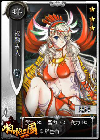 比起yy五星袁绍的玩家,yy五星孟获的这位可是用心多了。不仅想出了技能,还考虑到了和祝融夫人的配合。蛮王孟获,群雄 骑兵 统帅将军。专属战器:刀 被动:集中、勇武、神佑。专属战器:百兽猎刃,强化被动:勇武。连协:诸葛亮、刘禅、祝融夫人。技能:觉丛林烈火,消耗士气5 发动火计对自身周围敌方部队照成108600生命值伤害,持续14秒。实际伤害值和持续时间受双方智力差距影响。同时弱化敌方周围所有部队智力值30%,持续12+12秒。实际时间受双方智力差距影响。