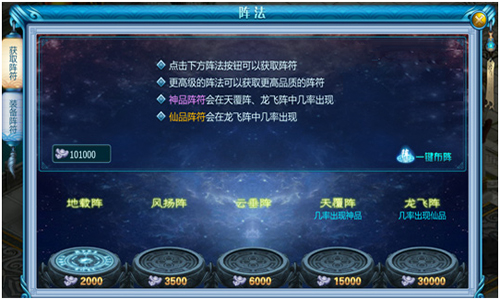 使用方法:点击阵法,并消耗对应阵法的银子,既可获得不同品质的阵符。例如:点击地载阵,花费2000银子即可获得该阵法的阵符。