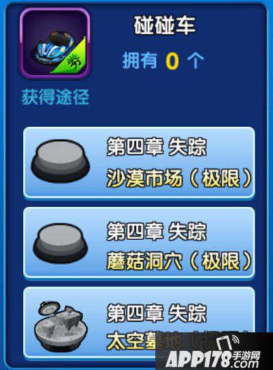a.通过碰碰车券合成,需要150个。碰碰车券有几率通过以下关卡获得:第四章失踪-沙漠市场(极限);第四章失踪-蘑菇洞穴(极限);第四章失踪-太空墓地(极限)