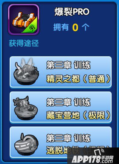 a.通过爆裂PRO券合成,需要30个。爆裂PRO券有几率通过以下关卡获得:第三章训练-精灵之都(普通);第三章训练-藏宝营地(极限);第三章训练-逃脱地铁(极限)
