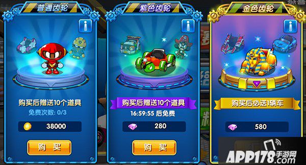 道具:改装S级以下赛车所需要的零件,有几率获得部分A级赛车和S级赛车。购买后必送1辆车。