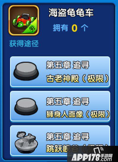 a.通过海盗龟龟车券合成,海盗龟龟车券需要999个,海盗龟龟车券获得关卡:第五章追寻-古老神殿(极限),第五章追寻-狮身人面像(极限),第五章追寻-跳跃峡谷(极限)