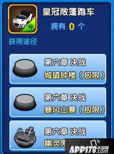 a.通过皇冠敞篷跑车券合成,皇冠敞篷跑车券需要80个,皇冠敞篷跑车券获得关卡:第六章决战-城镇钟楼(极限),第六章决战-暴风山寨(极限),第六章决战-幽灵鬼域(极限)