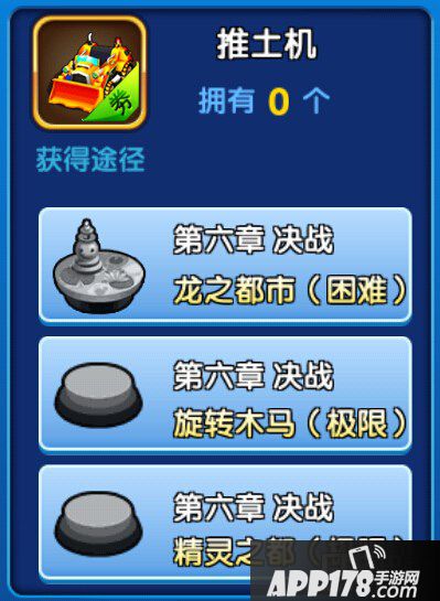 a.通过推土机券合成,推土机券需要120个。推土机券获得关卡:第六章决战-龙之都市(困难),第六章决战-旋转木马(极限),第六章决战-精灵之都(极限)