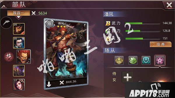 用于管理上阵武将的系统,可以对上阵武将进行挑选、升级、进阶和随从设置。