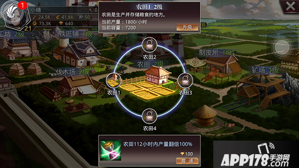 农田是生产并存储粮食的地方,粮食封地里最基础的材料,升级离不开他~随着农田等级的升高,产出也会变化哦~