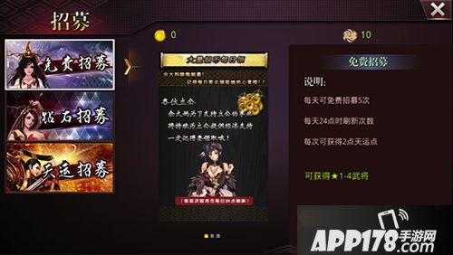 招募分为免费招募、钻石招募和天运招募;先来说说普通招募,主公们完成每日的任务,通过活跃度的提升,便可领取银币,一枚银币便可以进行一次免费招募,每次招募可以得到2点天运点。普通招募多数是2星卡,也有不低的几率能翻到3星武将的。