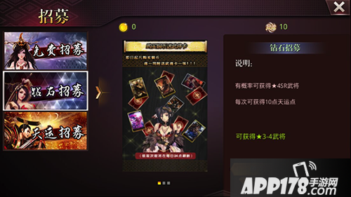 再来说说钻石招募,主公大人消耗钻石便可以进行此招募了,钻石招募多数是三星武将卡,同事有概率会获得4星的武将卡,几率也是大大提升了,也是得到4星武将卡的主要途径。同时每进行一次招募,就会获得10点天运点。当天运点达到100点便可以进行一次天运招募了。