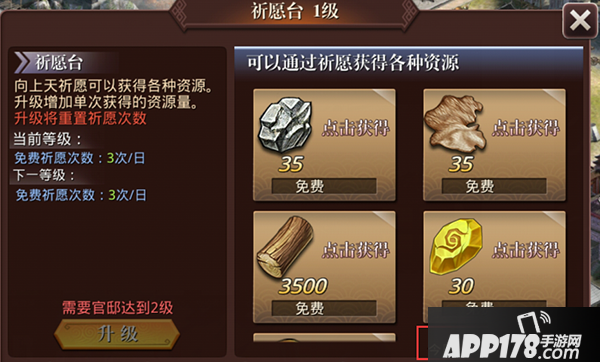 每天可以祈愿3次,而3次天赐的资源主公可以任意挑选,不过只有3次哦~但是升级祈愿台的等级,就可以增加祈愿的次数,天赐的机会也就更多,莫不是主公有上天相助,方可有这等机缘?小啪已然惊呆了,还请主公大人收下小啪的膝盖!