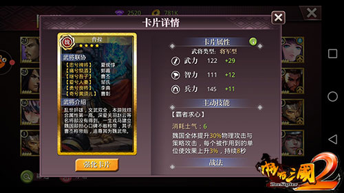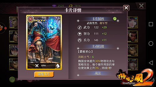 乱世奸雄,文武双全,本游戏综合属性第一高。深爱关羽、赵云等名将却没有得到。一声戎马建立魏国却担心口碑不敢称帝,其子曹丕称帝后,追尊其为魏武帝。在《啪啪三国2》中曹操是将军型武将,兵种为骑兵,主动技能“霸者求心”消耗6点士气,作用是魏国全体提升30%策略攻击和物理攻击,每个被作用到的单位使效果上升3%,持续8秒。联协武将有:夏侯惇、郭嘉、曹丕、邹氏、李典、曹彰。