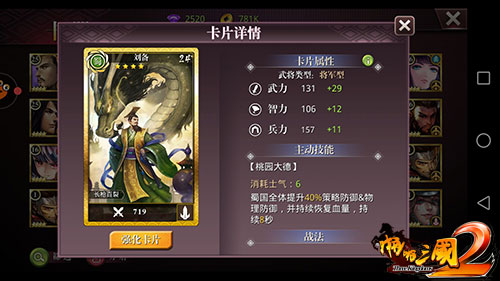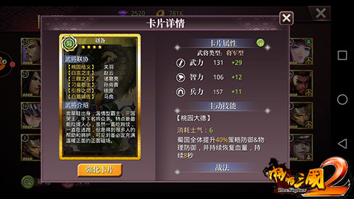 卖草鞋出身,温情型霸主,三国哭王,手下名将众多。特点是最能拉拢人心,虽然一直吃败仗,一直在逃跑,但是得到很多人的帮助和用户,可见刘备必定充满温暖正面的磁场。在《啪啪三国2》中刘备是将军型武将,兵种为枪兵,主动技能“桃园大德”消耗6点士气,作用是蜀国全体提升40%策略防御和物理防御,并持续恢复血量,持续8秒。联协武将有:关羽、赵云、诸葛亮、孙尚香、徐庶、马良。