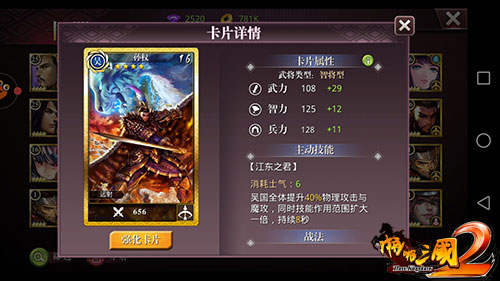 优生优育的典范,老爹孙坚,哥哥孙策。父子兄弟都是三国一等一的名将明军。传说孙权是中国并发家孙武的二十二代后裔。比较起勇武非凡的哥哥孙策,孙权在政治和治理方面更胜一筹。在《啪啪三国2》中孙权是智将型武将,兵种为弓兵,主动技能“江东之君”消耗6点士气,作用是吴国全体提升40%策略攻击和物理攻击,同时技能作用范围扩大一倍,持续8秒。联协武将有:孙策、周瑜、孙尚香、陆逊、吕蒙、步练师。
