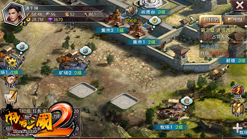 在《啪啪三国2》中,玩家走出主城或自己的封地,就会来到360度全景的中国大地图上。玩家不仅可以在地图上击败任务中的敌人,还能发现农田、矿场等资源点。玩家占领资源点后可根据时间获得相应资源的产出。如果你发现的资源点被其他玩家抢先占领了,那么你需要战胜该玩家配置的驻守部队才能进行占领。抢先占领无人驻守的资源点,是游戏前期非常重要的,只有在资源领先,才能在战力上领先。