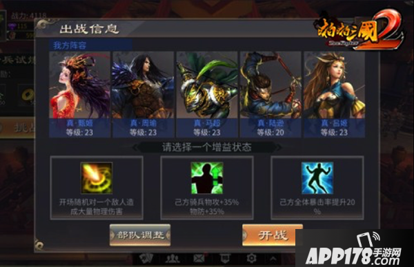 同时,每次挑战前,主公们会获得一个“BUFF”加成,或开场随机对一个敌人造成大量物理伤害、或己方骑兵物攻、物防增加、或提升己方全体暴击率等不同内容的效果,选择一个适合自己阵容的增益BUFF是制胜的关键哟!