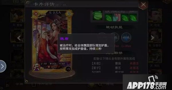 魏盾:被治疗时,给全体魏国部队增加护盾,按照策攻加成护盾值,持续10秒