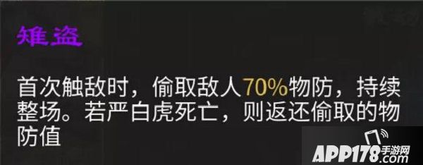 1、严白虎在首次接触敌人时,会偷取敌人70%的物防。也就是严白虎自己物防变多,敌人物防变少。