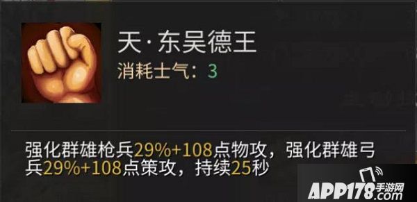 东吴德王:强化群雄枪兵29%+108点物攻,强化群雄弓兵29%+108点策攻,持续25秒
