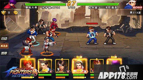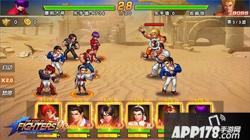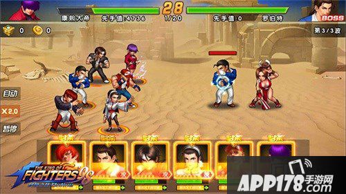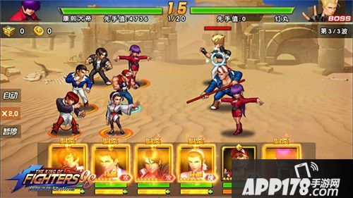 第一波不用说还是攒怒气;第二波后排增加了2个小BOSS,不过安迪很脆皮,优先击杀,前排需要能顶住蔡宝奇的一个大旋风和一个小旋风(PS:蔡宝奇的小旋风暴击很疼的);这样我们就可以不死人且满怒气进入第三波了,罗伯特配不知火舞,后排不知火舞脆皮(秒不掉她就让她冒星星或沉默),罗伯特、草薙京、特瑞的三个列杀不死也残了,何况还有神乐千鹤的群体沉默,前排罗伯特再吃八神庵和雷之夏美尔2个强力单体攻击必死无疑,没死不用怕还有普攻呢,如果这样还不死就要看神乐千鹤的沉默和特瑞的眩晕了。