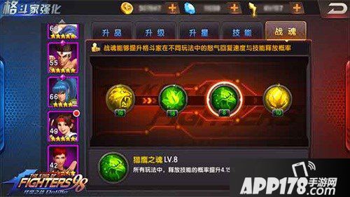 在《拳皇98终极之战OL》里,战魂系统对于格斗家的提升非常大。野熊之魂、恶虎之魂、玄武之魂、蝮蛇之魂根据格斗家定位不同,将拥有其一,可以在战斗中额外获得怒气,紫色品质解锁。而毒草之魂,每个格斗家在紫色+2的时候解锁,可以在竞技场中按一定比例增加生命值,满点提高100%生命值。猎鹰之魂,每个格斗家在紫色+4品质时解锁,可以提高技能攻击的释放概率,满点提升9.55%。坚石之魂,每个格斗家在橙色+1时解锁,任意模式下格斗家生命值提高,每点1000生命值。