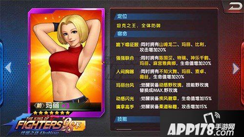 对先手值要求较高,个人感觉后手的玛丽不如陈国汉,人家开局中八神的大各种沉默集火,挂了还能有一半机会半血爬起来,玛丽死了就死了,可以说这属于一个不太适合对阵高先手高爆发野熊流的角色,但反之,只要对方先手爆发力一般,第一回合让你站住了发必杀,玛丽生存力胖子望尘莫及。能够和玛丽合作愉快的格斗家:夏妹儿的降攻和哈迪兰的反控,队伍前排会更稳健。而假如队伍中有罗伯特,那么作为女性格斗家,玛丽还可获得额外的攻击加成。