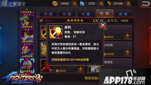 从技能上来看,K'普通技能和必杀技能都有一个特性,就是越到残局越厉害,而K'的普通技能对防御属性的格斗家还有60%的额外伤害。乍一看上去貌似没有什么,可是仔细看你会发现,K'是攻属性的格斗家,但是技能却有破防效果,这实在有点逆天了。而第四技能提供的伤害率虽然看上去少的可怜,可是如果对比起草薙京全队攻击加成的话效果却不知好了多少倍。