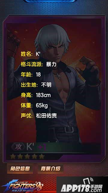 那么介绍到这里大家可以看的出来K'不但有资格当14资质的背景,也有当14资质格斗家的实力。如果你已经拥有K'的话培养他的效果肯定会优于你培养草薙京和特瑞的效果的,K'值得你拥有!