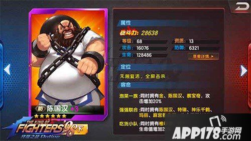 最后看看竞技场:这里也是大家最关注的话题了,大家的分歧也在这里,陈国汉在竞技场里的作用大吗?木木可以负责任的告诉大家作用不比玛丽大七等人的好,但是小看陈国汉复活和晕人技能的玩家绝对会吃大亏,晕人的作用就不说了,就说复活,在各位打竞技场的时候有没有过好不容易把大猪打死了,自己八神、罗伯特的必杀满了,然后对面的大猪却没有消失,原地又站了起来,在你下个回合攻击时,八神的必杀萝卜的必杀又都打在了大猪的身上,从而浪费了两个必杀,当对面必杀好的时候你却吃了个正着?