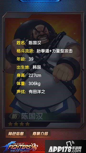 横看成岭侧成峰,高矮胖瘦各不同。纵观《拳皇98终极之战OL》的名人堂中,陈国汉在造型上就足够满足肉盾的资格了。可是如今的陈国汉缺不被玩家看好。这究竟是为什么呢?陈国汉倒地好还是不好?木木在这里为大家解密!