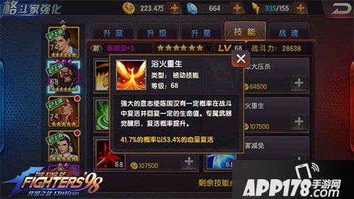 浴火重生:强大的意志使陈国汉有一定概率在战斗中复活并回复可观的生命值42%复活率。
